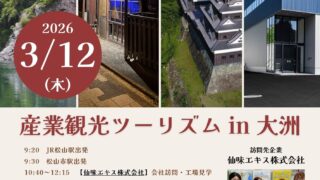 2026年3月12日(木)、産業観光ツーリズムがついに大洲市で開催されます!「産業観光ツーリズム in 大洲」は、観光と産業理解を掛け合わせた体験型プログラムを通じて、学生と企業、そして地域との質の高い出会いを創出します。会社説明や工場見学...