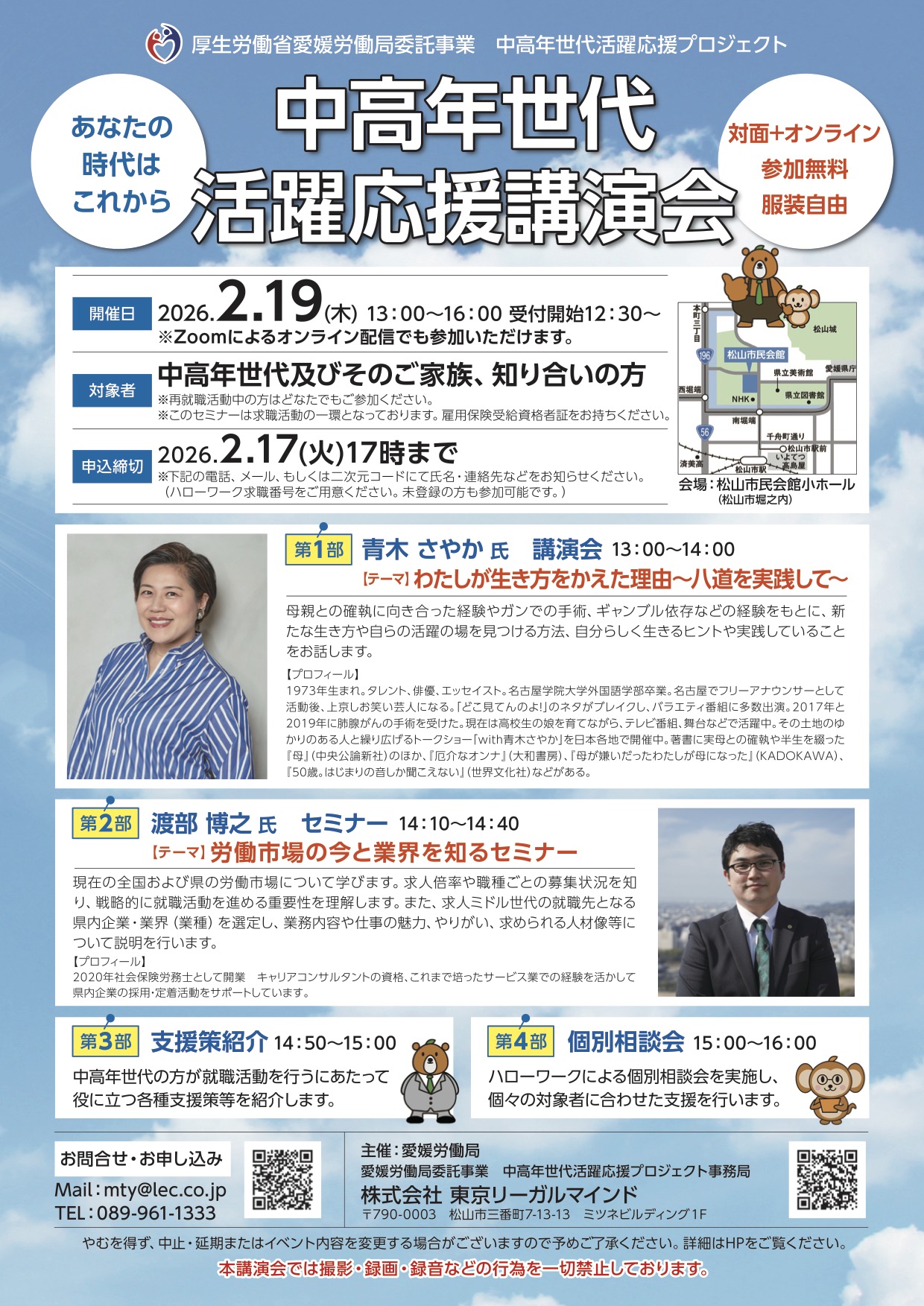 ECCA会員の渡部博之さんが、厚生労働省 愛媛労働局主催のセミナーに登壇します。テーマは「労働市場の今と業界を知る」です。全国および県の労働市場について学び、戦略的に就職活動を進める重要性を理解します。また、求人ミドル世代の就職先となる県内企業や業界(業種)を選定し、業務内容や仕事の魅力、やりがい、求められる人材像等について説明を行います。
